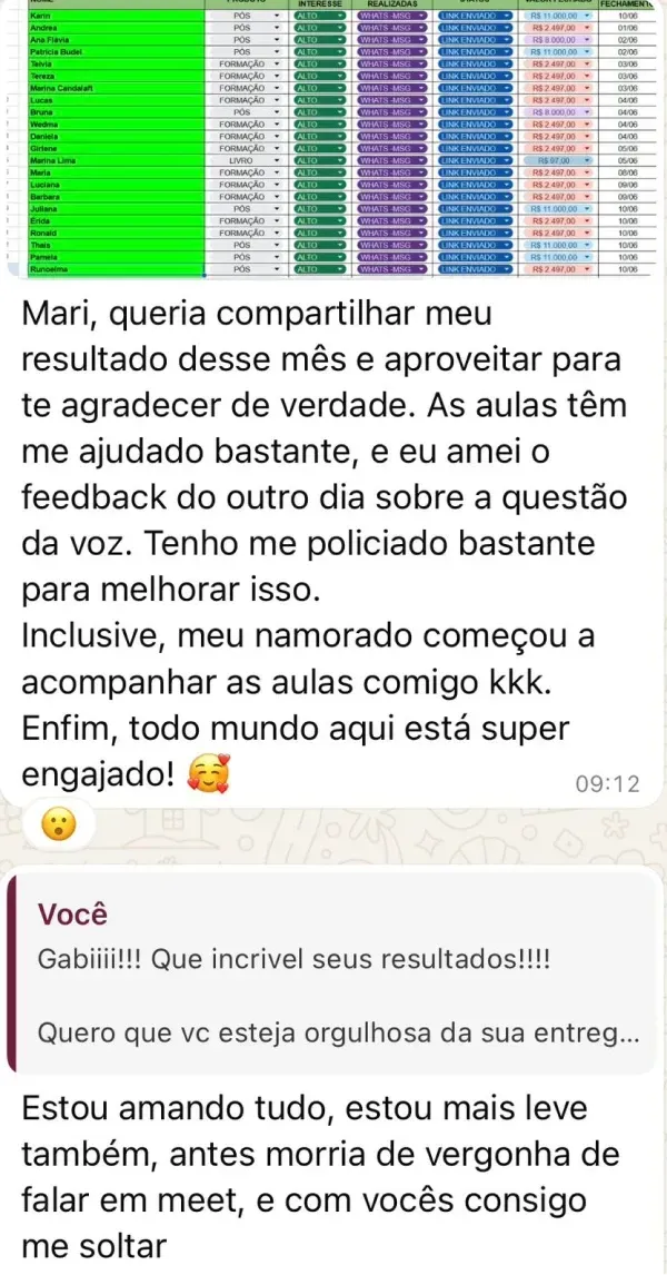 "Bati mais de R$100 mil em vendas em um único mês. As aulas me ajudaram a destravar, ganhei leveza, confiança e hoje consigo me comunicar com muito mais segurança em reuniões, algo que antes me travava completamente"