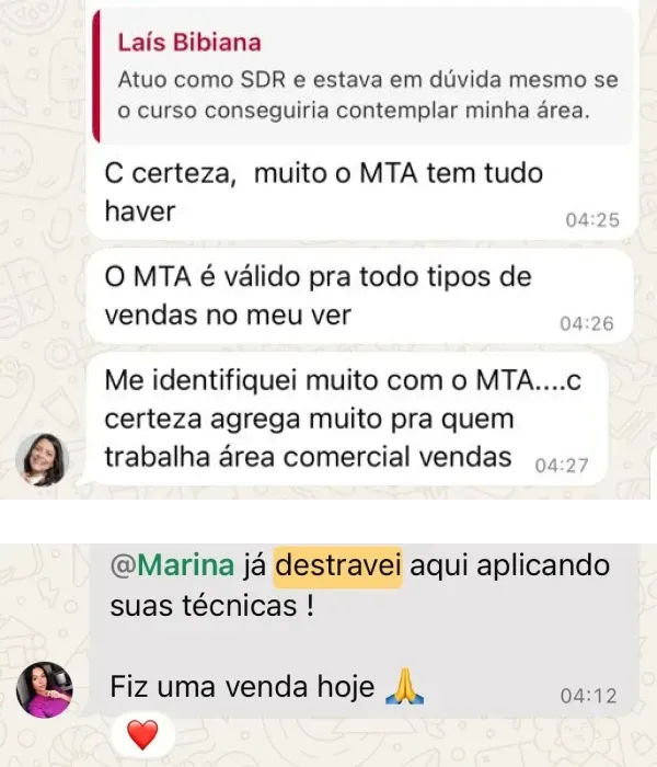 "Consegui fazer a primeira venda com menos de um mês no MTA. A Marina é incrível! Quando eu mais precisei, ela não só me ensinou sobre vendas, mas me ajudou a enxergar meu caminho profissional de um jeito novo.